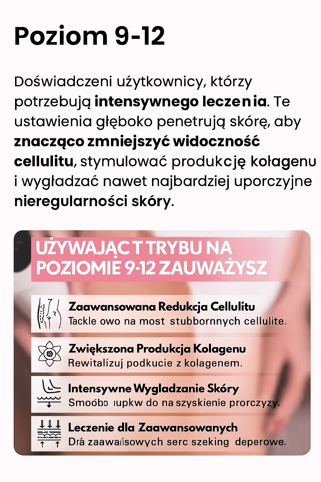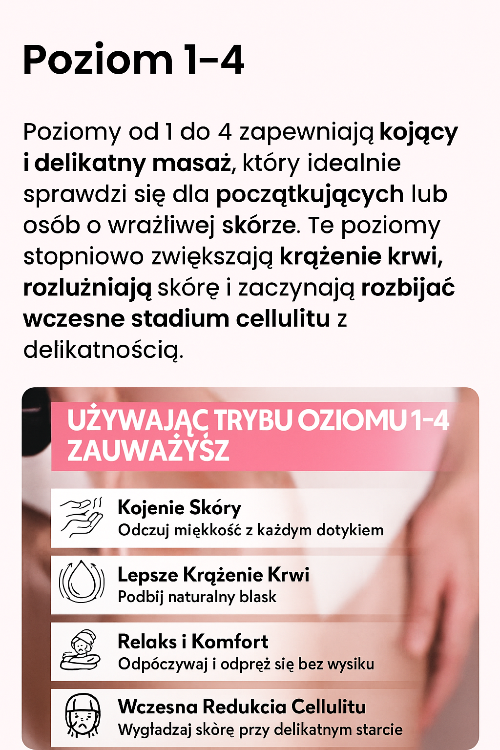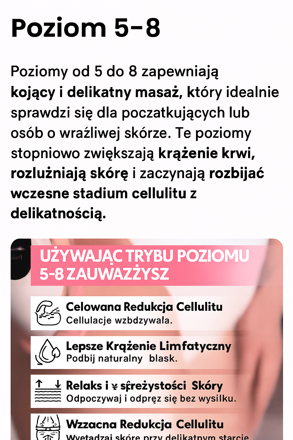 Dla najlepszych rezultatów zalecamy korzystanie z naszego masażera antycellulitowego 3–5 razy w tygodniu przez około 10 minut na sesję.